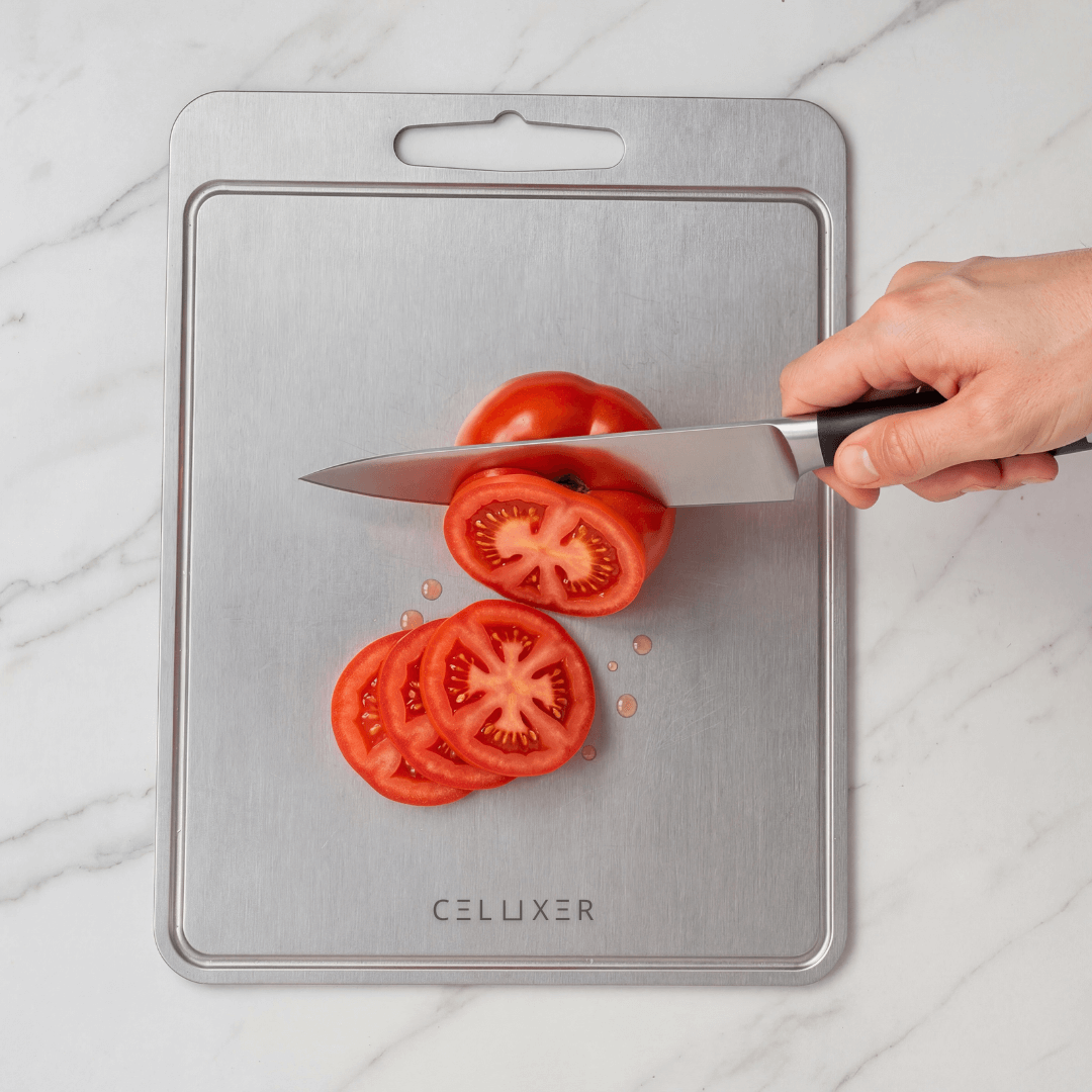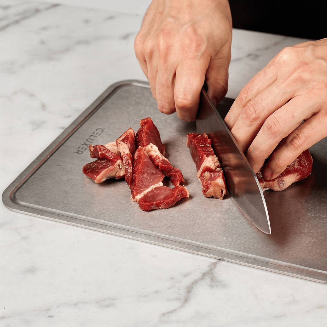 Plastic snijplanken laten microplastics, BPA, ftalaten, PFAS achter in je eten, een onzichtbaar risico voor je gezondheid. De Celuxer® Titanium Pro is microplastic-vrij dankzij het duurzame ontwerp van het antibacteriële titanium.
