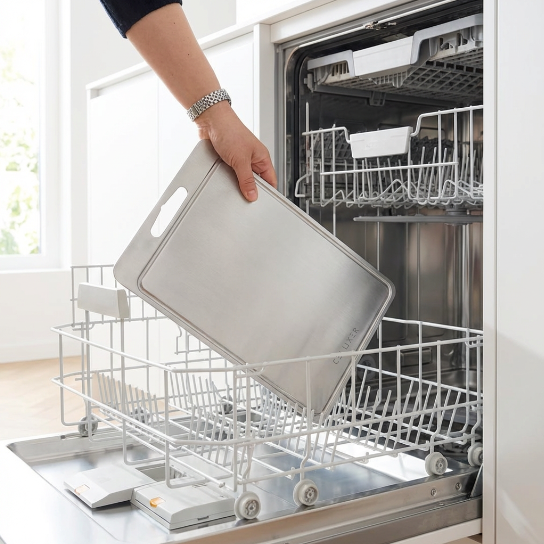 Zelfs bij extreem hoge temperaturen blijft het materiaal intact en veilig in gebruik. Je kunt de plank zonder zorgen afspoelen onder de kraan, reinigen met alle soorten afwasmiddelen of in de vaatwasser plaatsen.